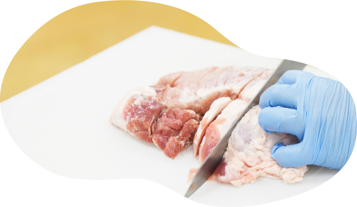 私たちの工場では、畜肉原料(牛・豚・鶏)を用途に適した形でカットし、「煮る・焼く・蒸す・炒める・レトルト加熱」工程でさらに加工を加え、自社配合の調味料で味付けした製品を、お客様のご希望の量目で包装しています。